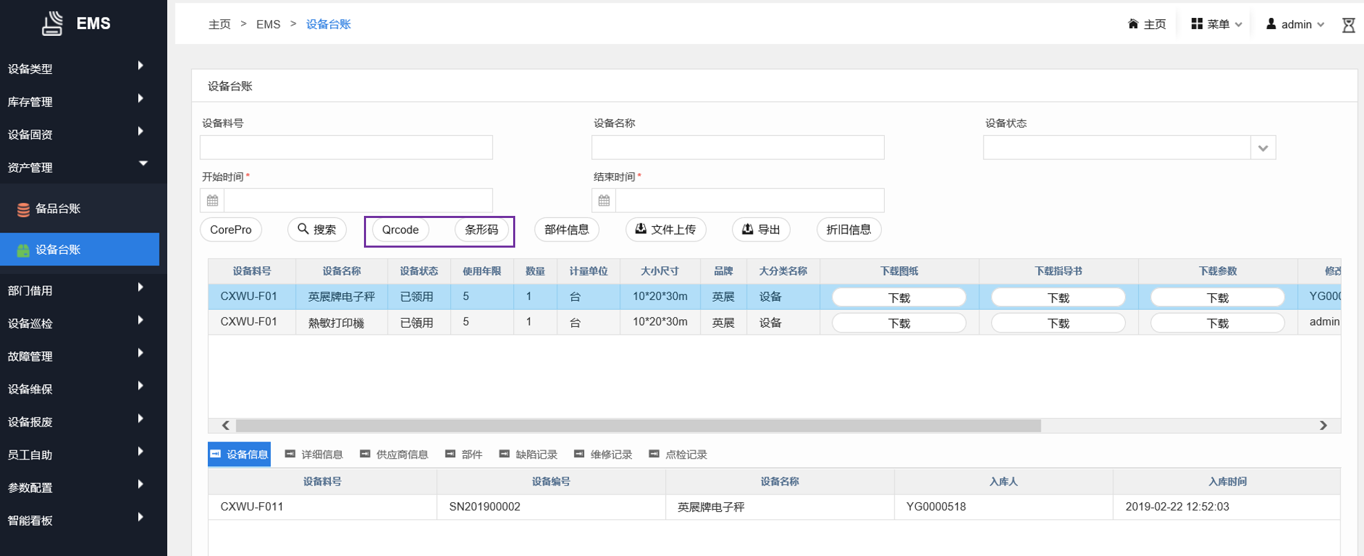 利用系统QR code功能,在线生成设备的二维码和条形码。