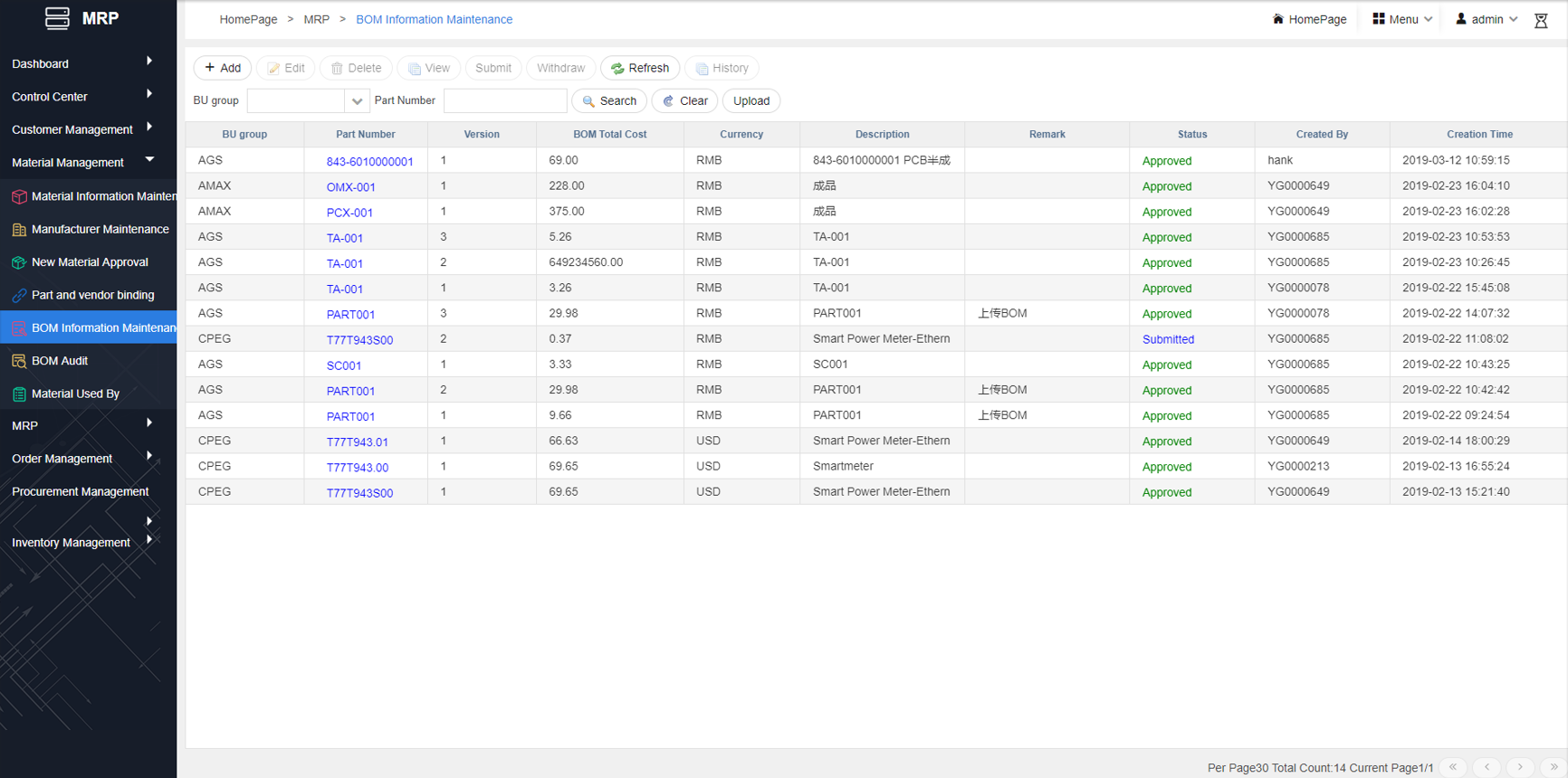 物料模块可创建和维护物料信息,BOM信息,制造商信息等,且可支持根据子物料查询到所有BOM下包含此子物料的BOM信息,可快速定位需要查询的BOM。